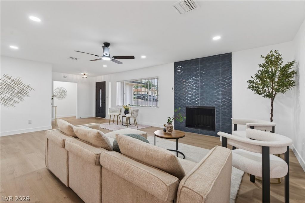 Beautifully remodeled 3-bedroom, 2-bath home in Henderson with NO HOA featuring an open-concept kitchen, dining, and family room with a cozy wood-burning fireplace. The primary suite offers two closets, including a walk-in. One secondary bedroom has direct backyard access. Enjoy a dedicated laundry room with storage shelves and a narrow exterior-access storage room for added convenience. The property also features a 2-car detached garage with rear access plus a front driveway for extra parking. Move-in ready and centrally located near shopping, dining, and freeway access?this Henderson home offers flexibility with no HOA restrictions.